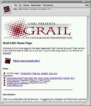 Grail(グラール)はPythonと呼ばれるオブジェクト 指向スクリプト言語で作られたブラウザです。Grail は開発途中のブラウザですが、HotJava にも劣らない面白いブラウザですので、ここに紹介致します。まず、次がGrailの初期画面です。