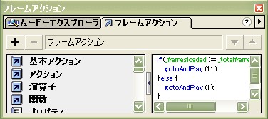 もし、最初の10コマがローディング中の表示であり、一瞬でローディングを終えた場合は11コマへ飛ばしたいなら、1コマ目へもまったく同じ内容の「アクション」を指定すればいいわけです。また、ローディング中の表示を除くムービー全体を繰り返したければ、一番最後のコマへ2行目の「gotoAndPlay(11);」だけ書き込んで下さい。いっぽう、繰り返さないで停止させたいなら「アクション」の「stop」を選ぶだけで、次が右側の窓の表示内容です。if (_framesloaded >= _totalframes) { gotoAndPlay (11); } else { gotoAndPlay (1); }